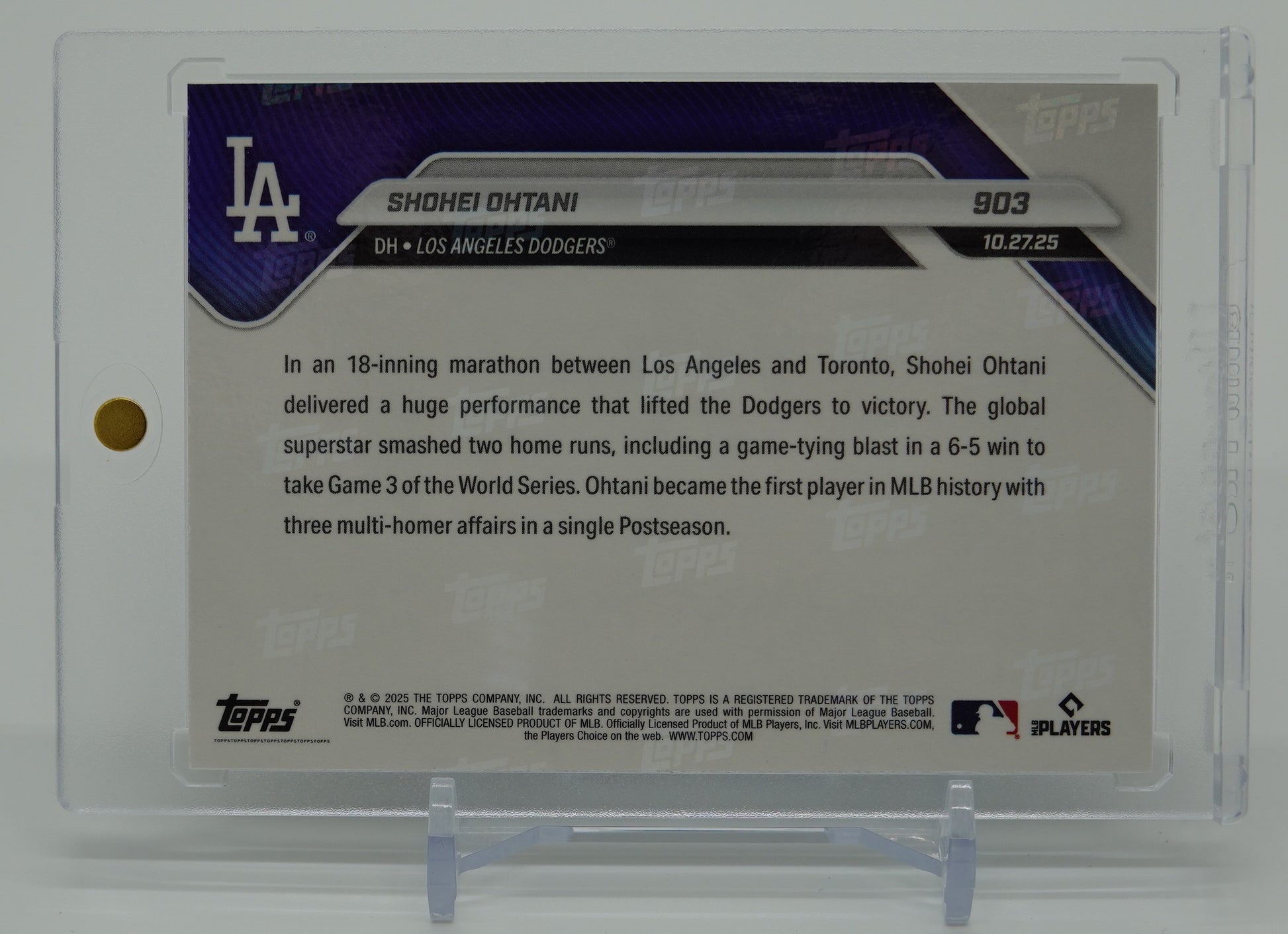 2025年10月27日 World Series Game 3:ワールドシリーズ第3戦で 2本のホームランを放ち、MLB史上初のポストシーズン 3度のマルチホームランを達成した記念の「Topps NOW」カードです(Print Run:58,583枚) / 2025 MLB Topps NOW Card #903 - PR: 58,583