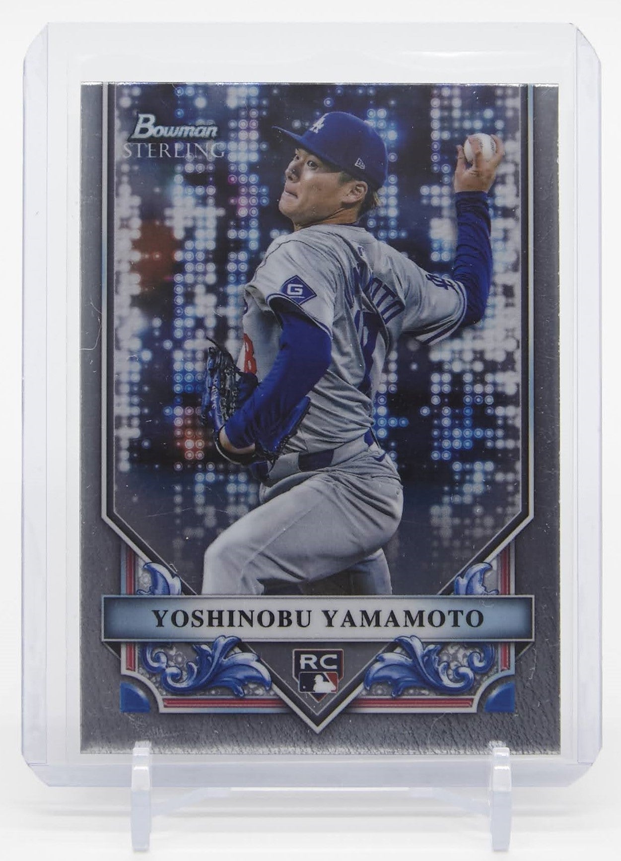 Bowmanシリーズの高級版「2024 Bowman Sterling Baseball」に封入された、山本由伸選手のルーキーカードです。クローム調仕様がカッコいい 1枚です。